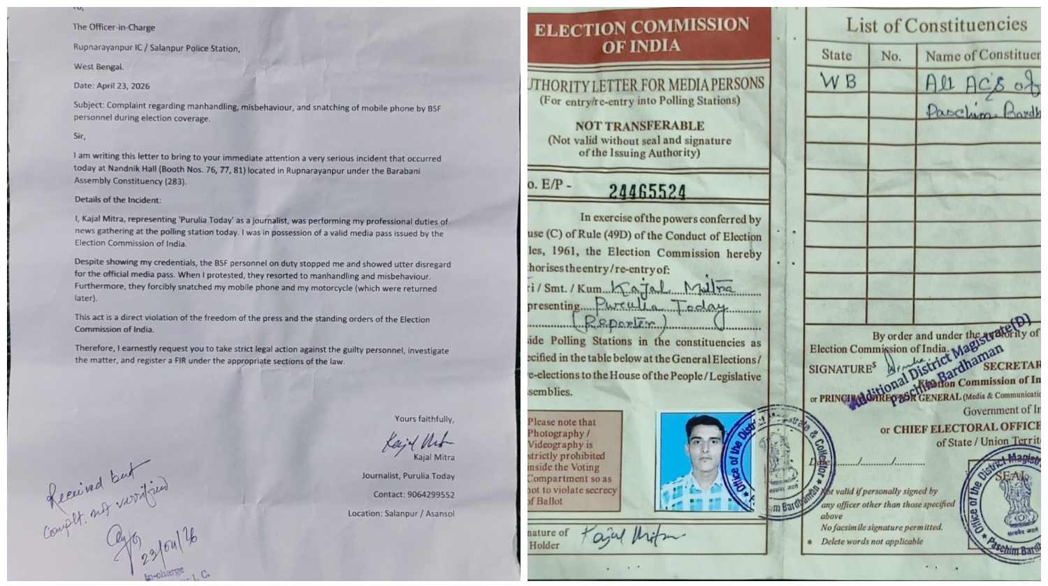 तहलका न्यूज 24 संवाददाता काजल राय चौधरी 26 अप्रैल 2026 सालानपुर। पश्चिम बंगाल विधानसभा चुनाव के दौरान बाराबानी क्षेत्र से एक चिंताजनक मामला सामने आया है, जिसने प्रेस की स्वतंत्रता और चुनावी व्यवस्था पर सवाल खड़े कर दिए हैं। रूपनारायणपुर के नांदनिक हॉल स्थित कई मतदान केंद्रों पर कवरेज कर रहे पत्रकार काजल मित्रा के साथ केंद्रीय सुरक्षा बल के जवानों द्वारा कथित दुर्व्यवहार और मारपीट का आरोप लगा है।बताया जा रहा है कि काजल मित्रा के पास भारत निर्वाचन आयोग द्वारा जारी वैध मीडिया पास मौजूद था, इसके बावजूद मौके पर तैनात जवानों ने उस पास को स्वीकार करने से इनकार कर दिया। प्रत्यक्षदर्शियों के अनुसार, जवानों ने कथित तौर पर पास को अमान्य बताते हुए उन्हें कवरेज से रोका। इस दौरान स्थिति इतनी बिगड़ गई कि पत्रकार के साथ हाथापाई और धक्का-मुक्की की नौबत आ गई।आरोप है कि इस घटनाक्रम में पत्रकार का कैमरा, मोबाइल फोन और मोटरसाइकिल भी छीन ली गई। हालांकि बाद में स्थानीय पुलिस के हस्तक्षेप के बाद उनका सामान वापस कराया गया, लेकिन इस पूरे घटनाक्रम ने सुरक्षा व्यवस्था की कार्यप्रणाली पर गंभीर प्रश्न खड़े कर दिए हैं।घटना के बाद आसनसोल-दुर्गापुर सहित आसपास के क्षेत्रों के पत्रकारों में नाराजगी देखी जा रही है। मीडिया कर्मियों का कहना है कि यदि अधिकृत पहचान पत्र के बावजूद इस तरह की घटनाएं होती हैं, तो स्वतंत्र और निष्पक्ष रिपोर्टिंग कैसे संभव होगी। उन्होंने इसे प्रेस की आजादी पर सीधा हमला बताया है।इस मामले में पत्रकार काजल मित्रा ने रूपनारायणपुर पुलिस चौकी में लिखित शिकायत दर्ज कराई है। साथ ही उन्होंने मुख्य चुनाव आयोग, राज्य चुनाव आयोग और स्थानीय प्रशासन को भी पत्र भेजकर कार्रवाई की मांग की है। पत्रकार संगठनों ने दोषी सुरक्षाकर्मियों पर सख्त कार्रवाई, घटना की निष्पक्ष जांच और चुनाव के दौरान मीडिया की सुरक्षा सुनिश्चित करने की मांग उठाई है।यह घटना चुनाव जैसे संवेदनशील समय में लोकतांत्रिक मूल्यों और अभिव्यक्ति की स्वतंत्रता को लेकर गंभीर बहस छेड़ती है। अब देखना होगा कि संबंधित एजेंसियां इस मामले में क्या कदम उठाती हैं और भविष्य में ऐसी घटनाओं की पुनरावृत्ति रोकने के लिए क्या व्यवस्था की जाती है।