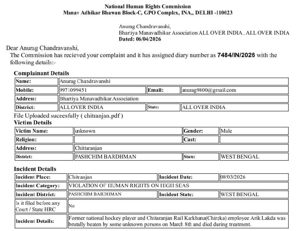 तहलका न्यूज 24 संवाददाता काजल राय चौधरी चित्तरंजन। चर्चित एरिक लकड़ा हत्याकांड को लेकर अब न्याय की दिशा में एक महत्वपूर्ण पहल सामने आई है। भारतीय मानवाधिकार एसोसिएशन, जिला पश्चिम बर्धमान ने इस मामले को गंभीरता से लेते हुए राष्ट्रीय मानवाधिकार आयोग में आधिकारिक शिकायत दर्ज कराई है। आयोग द्वारा शिकायत को स्वीकार कर लिया गया है और केस दर्ज होने के साथ ही केस नंबर भी जारी कर दिया गया है, जिससे पीड़ित परिवार और स्थानीय लोगों में न्याय की उम्मीद जगी है।एसोसिएशन के जिला अध्यक्ष एवं मंडल अध्यक्ष डॉ. विनय कुमार ने बताया कि एरिक लकड़ा की हत्या बेहद संदिग्ध परिस्थितियों में हुई थी और इस मामले में प्रशासन के पास पर्याप्त सबूत मौजूद होने के बावजूद अब तक किसी भी आरोपी की गिरफ्तारी नहीं हो पाई है। उन्होंने कहा कि प्रशासन द्वारा बार-बार जांच जारी है कहकर मामले को टालना अत्यंत चिंताजनक और असंतोषजनक है।इसी निष्क्रियता को देखते हुए एसोसिएशन ने मानवाधिकार आयोग का दरवाजा खटखटाया है, ताकि मामले में पारदर्शिता बनी रहे और निष्पक्ष जांच सुनिश्चित की जा सके। संगठन का मानना है कि आयोग के हस्तक्षेप से जांच प्रक्रिया में तेजी आएगी और दोषियों को जल्द सजा मिल सकेगी।यह पहल न केवल एरिक लकड़ा मामले में न्याय दिलाने की दिशा में एक मजबूत कदम है, बल्कि समाज में मानवाधिकारों की रक्षा के प्रति एक सशक्त संदेश भी देती है। वहीं, डॉ. विनय कुमार ने जानकारी दी कि 8 अप्रैल को शाम 6 बजे संगठन द्वारा चित्तरंजन थाना में एक ज्ञापन सौंपा जाएगा। इस दौरान दोषियों की शीघ्र गिरफ्तारी और पीड़ित परिवार को न्याय दिलाने की मांग प्रमुख रूप से उठाई जाएगी।